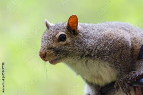 © Jennifer, Obraz premium A young gray squirrel perches on a shepherds hook while attempting to reach a bird feeder. Close up head shot. Background blurred.