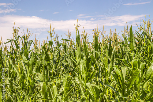 Fototapeta premium A young green corn field against sky with clouds background
