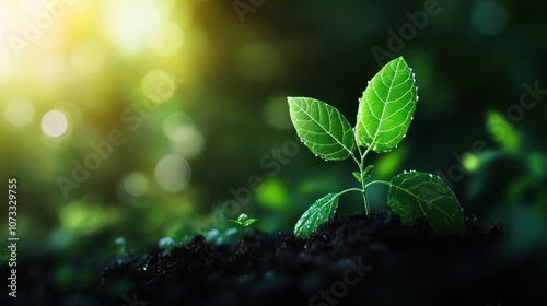 Naklejka premium A young green plant with dew-covered leaves emerges from rich, dark soil, illuminated by soft sunlight in a lush environment.