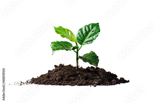 © Naem, Fototapeta premium A young green plant with vibrant leaves emerging from rich, dark soil, isolated on a transparent background.