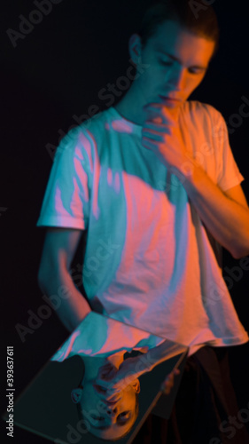 © Maxim, Fototapeta premium a young guy holds a mirror in his hand, looks at his reflection, a yellow and blue vet illuminates a man