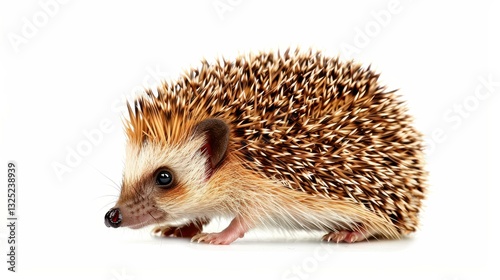 Fototapeta premium A young hedgehog with a curious expression, exploring its surroundings against a white background.
