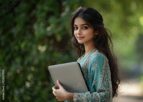 Fototapeta premium A young Indian girl holding a laptop in her hand standing in the outdoor
