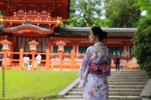 © mastersbaby0526, Fototapeta premium a young Japanese woman in summer kimono (yukata) standing in front of a red traditional Japanese building