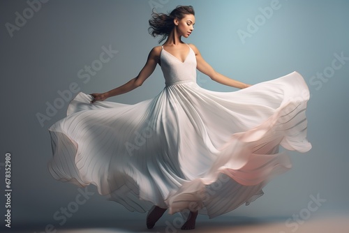 Naklejka premium A young lady in a white, wedding, silk dress is spinning, the dress is...