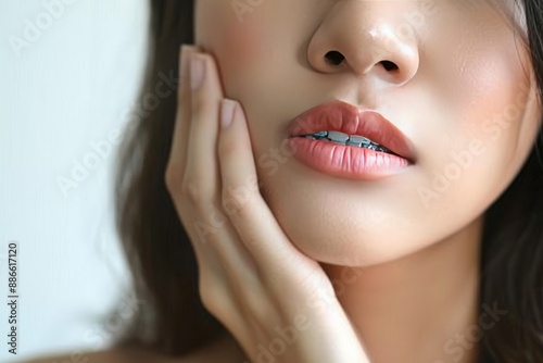 Obraz premium A young lady suffering toothache holding her painful jaw.