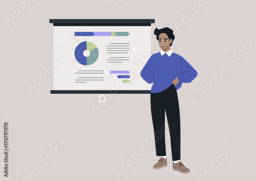 © nadia_snopek, Fototapeta premium A young male Caucasian financial advisor reporting on a conference, a video projector screen with a pie chart infographics