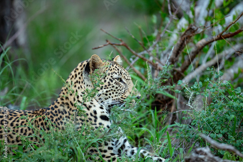 © Darrel, Naklejka premium A young male leopard sitting camouflaged