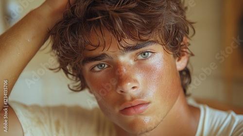 © Aamir, Fototapeta premium A young man concerned about his hair, looking into a mirror or camera