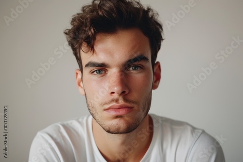© useful pictures, Fototapeta premium A young man displays confidence with a serious expression and intense focus. The close-up highlights his features against a simple backdrop, emphasizing his individuality.