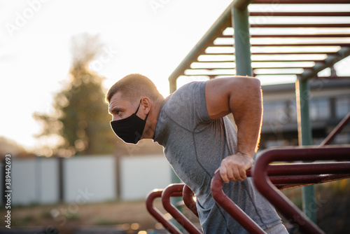 Fototapeta premium A young man does push-UPS, pull-UPS on a sports field in a mask during a...