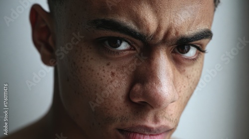 © mila103, Fototapeta premium A young man gazes into the camera with a serious expression. The lighting highlights his freckles and sharp features creating a dramatic intense atmosphere.