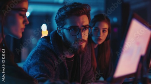 © Fakhri Afrasiyabov, Obraz premium A young man hacker conversing with both male and female coworkers while using a computer in a startup