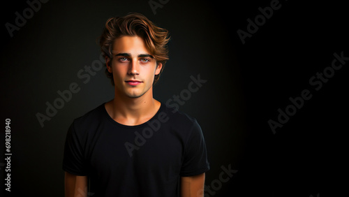 © Kseniya, Naklejka premium A young man in a black T-shirt with free space for a logo - black background with copy space
