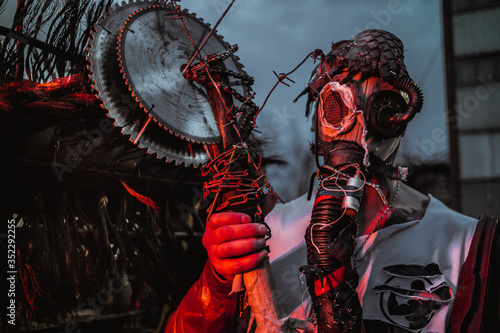 Fototapeta premium a young man in a factory during the Apocalypse in a castle and with a saw