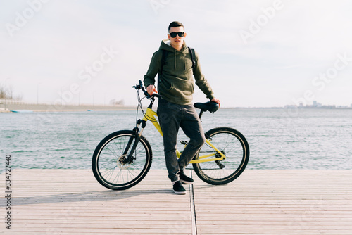 © Дарья Фомина, Obraz premium a young man in khaki sportswear and glasses stands on a pontoon near the lake and holds a yellow Bicycle near him on a Sunny spring day