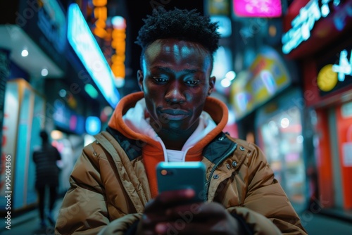 Fototapeta premium A young man is seen focused on his phone amidst a vibrant and busy street filled with bright neon lights and signs, capturing the essence of modern urban nightlife.