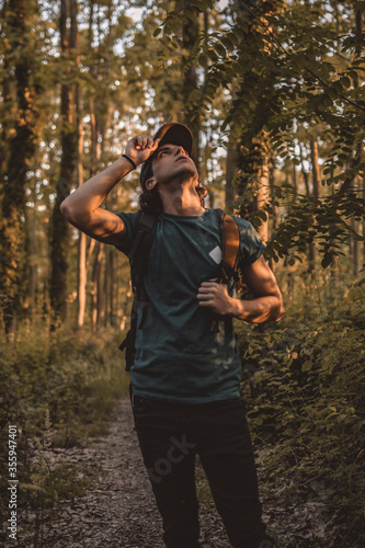 © Christian, Obraz premium A young man looking around in the middle of the forest