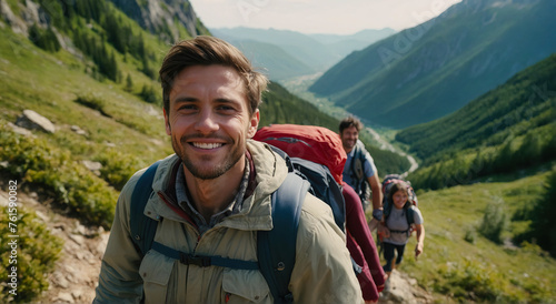 © Arpad, Naklejka premium A young man of around 30 is hiking in the mountains with a backpack. Generated Ai