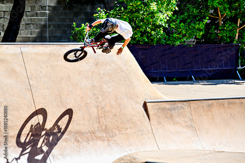 © Toni, Fototapeta premium A young man practicing BMX and performing tricks at the skatepark.