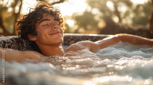 © Atchariya63, Obraz premium A young man relaxes in a hot tub, enjoying serenity and warm sunlight.