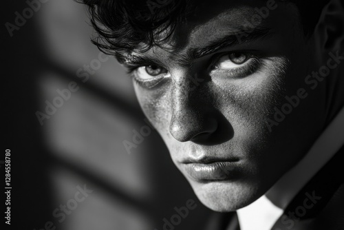 © stockphoto02, Obraz premium A young man's intense gaze, captured in a dramatic black and white close-up.