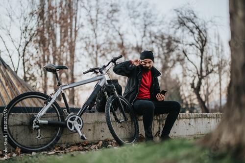 Fototapeta premium A young man sits on a concrete wall in a park next to his mountain bike, making a face or gesture during his break.