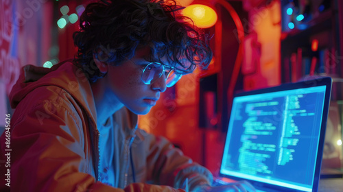 © sommersby, Obraz premium A young man wearing glasses sits in a dark room illuminated by blue and red lights, focusing intently on his laptop screen, likely coding or working on a programming project