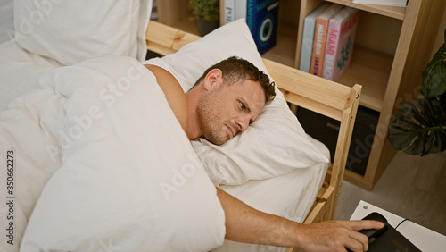 © Krakenimages.com, Obraz premium A young man with a beard waking up in a bedroom, reaching for his smartphone.
