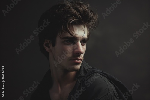 © ChaoticMind, Fototapeta premium A young man with a fashionable hairstyle and introspective expression posing against a dark background