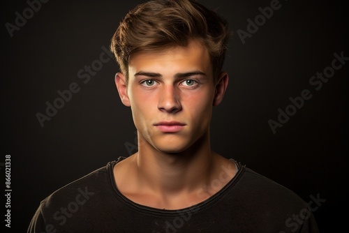 © MediaRaw, Naklejka premium A young man with brown hair and a black shirt is looking at the camera
