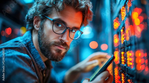 © Bolbik, Obraz premium A young man with glasses and a beard working in a data center, using a tablet. Bright red server lights reflect on his focused expression