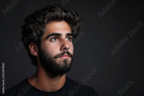 © Jorge Ferreiro, Fototapeta premium A young model with a beard and dark hair posing in front of the camera