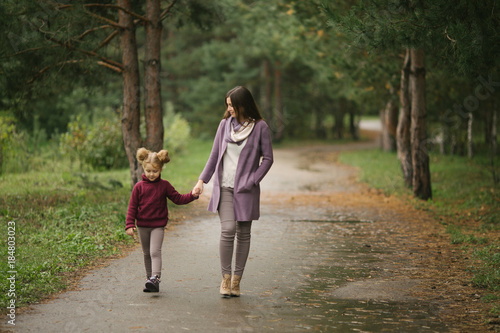 Fototapeta premium A young mother and her little daughter are walking along the path in the park