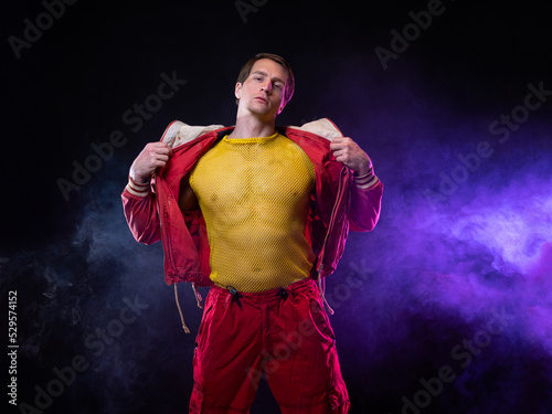 Obraz premium a young muscular man in a bright outfit poses in a pretentious pose, style...