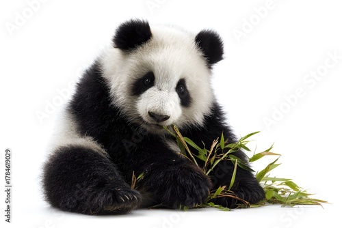 © saran, Naklejka premium A young panda sits and eats green bamboo stalks on a white background.