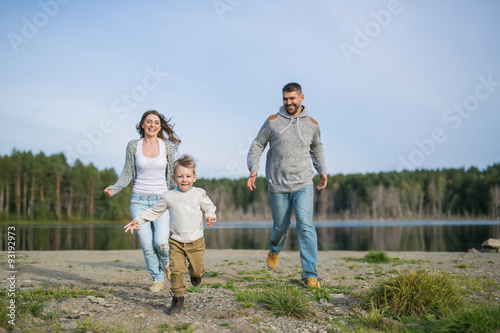 © kristinakibler, Fototapeta premium A young parents run behind their son on a coast