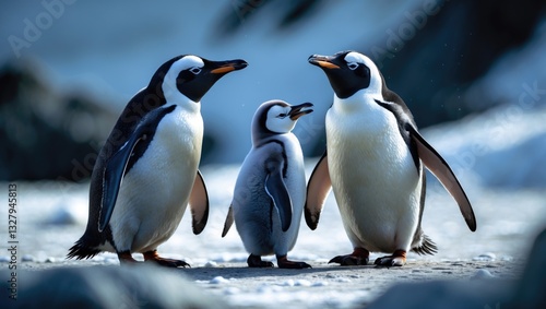 © pngking, Fototapeta premium A young penguin imitates its parent vocalizing a display call.