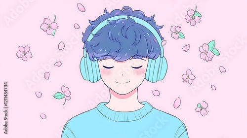 © aironamad, Obraz premium A Young Person Enjoying Music Under a Blue Sky Surrounded by Falling Petals
