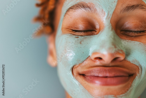 © Spicy World, Fototapeta premium A young person relaxing with a green clay mask on their face, enjoying skincare in a calm, serene environment