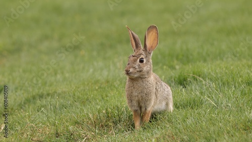 Fototapeta premium A young rabbit eats fresh spring grass in a California park.