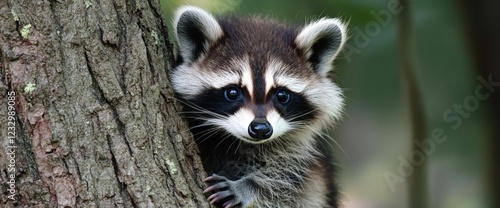 Fototapeta premium A young raccoon kit curiously peers from behind a tree trunk, showcasing its distinct markings and inquisitive nature in a vibrant forest setting under natural light