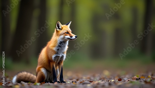 Fototapeta premium A young red fox sits attentively in the woods its ears perked up as it observes its surroundings