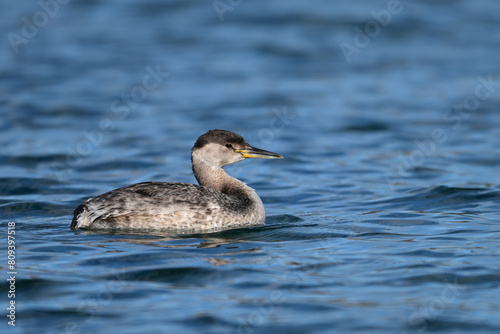 Fototapeta premium A young Red-necked Grebe duck bird floating alone on a lake