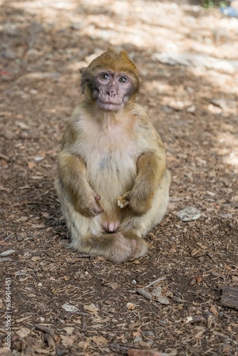 Obraz premium A young small Barbary Macaque monkey or ape, sitting on the ground, eating...
