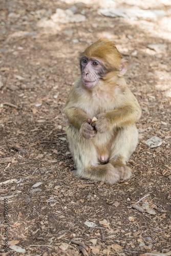 Obraz premium A young small Barbary Macaque monkey or ape, sitting on the ground, eating...