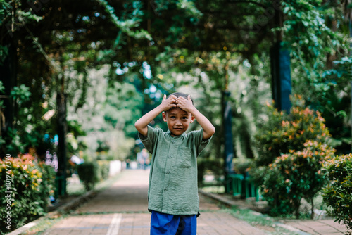© idham, Naklejka premium A young Southeast Asian child holding their head, expressing discomfort or deep thought