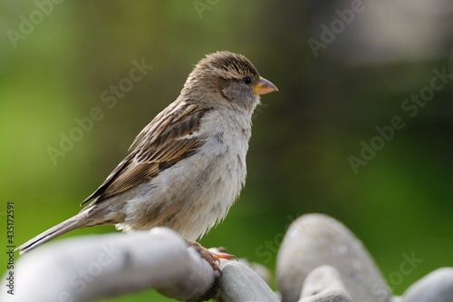 © Milan, Fototapeta premium A young sparrow sits on a stick near the stones. Czechia. Europe.