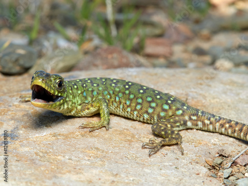 © Macronatura.es, Naklejka premium A young specimen of ocellated lizard on a very aggressive stone. Timon lepidus.