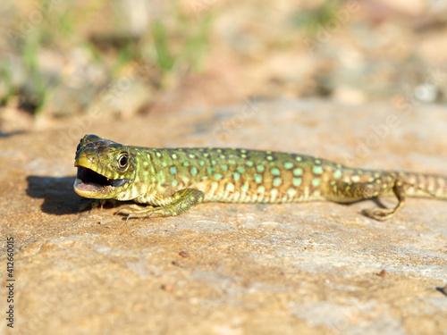 © Macronatura.es, Naklejka premium A young specimen of ocellated lizard on a very aggressive stone. Timon lepidus.